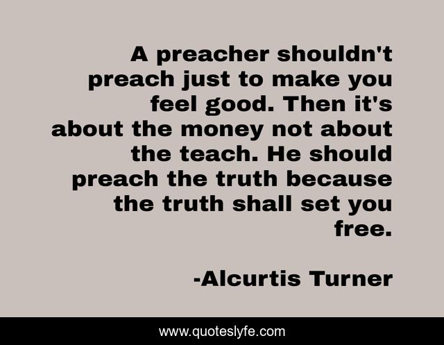 This page presents the quote "A preacher shouldn't preach just to make you feel good. Then it's about the money not about the teach. He should preach the truth because the truth shall set you free.". Author of this quote is Alcurtis Turner. This quote is about christian, pastor, christianity, quotes, false-prophets, preaching, church, gospel, ispirational,.