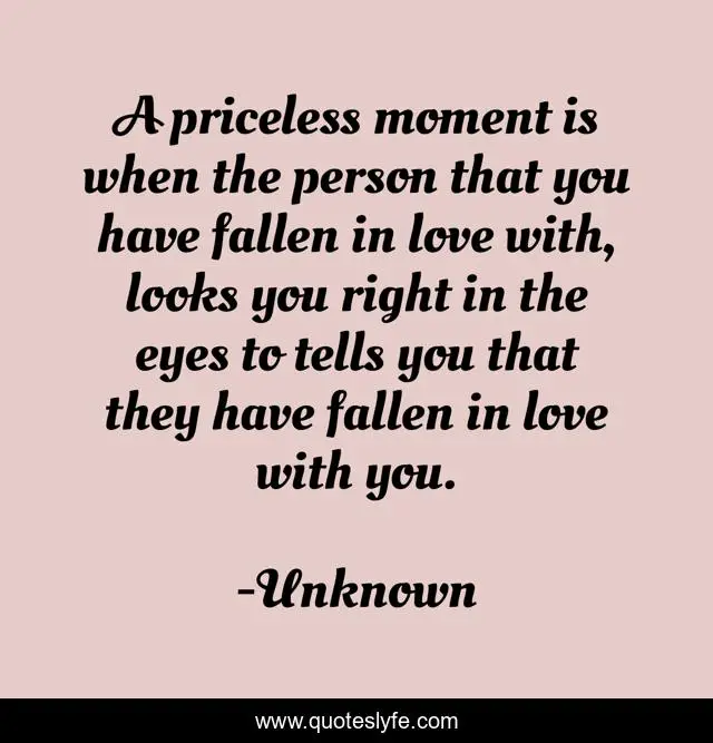 This page presents the quote "A priceless moment is when the person that you have fallen in love with, looks you right in the eyes to tells you that they have fallen in love with you.". Author of this quote is Unknown. This quote is about will-never-happen, falling-in-love,.