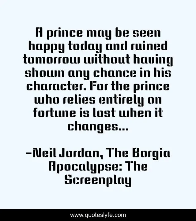 This page presents the quote "A prince may be seen happy today and ruined tomorrow without having shown any chance in his character. For the prince who relies entirely on fortune is lost when it changes...". Author of this quote is Neil Jordan, The Borgia Apocalypse: The Screenplay. .