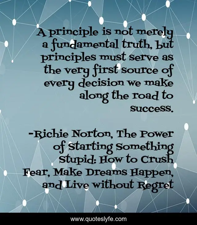 This page presents the quote "A principle is not merely a fundamental truth, but principles must serve as the very first source of every decision we make along the road to success.". Author of this quote is Richie Norton, The Power of Starting Something Stupid: How to Crush Fear, Make Dreams Happen, and Live without Regret. This quote is about fundamental-truth, decision, serve, principles, first-source, principle, truth, road-to-success, sucess,.