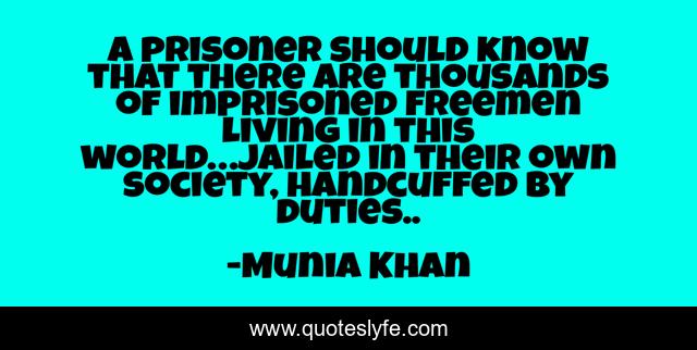 This page presents the quote "A prisoner should know that there are thousands of imprisoned freemen living in this world…jailed in their own society, handcuffed by duties..". Author of this quote is Munia Khan. This quote is about duty, family, imprisoned, thousand, imprisonment, wisdom, handcuffed, jail, prison,.