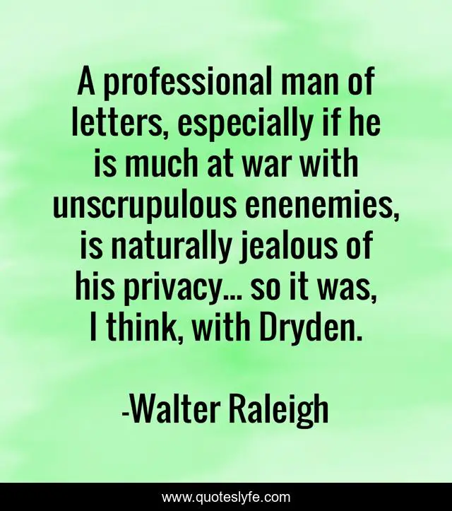 This page presents the quote "A professional man of letters, especially if he is much at war with unscrupulous enenemies, is naturally jealous of his privacy... so it was, I think, with Dryden.". Author of this quote is Walter Raleigh. This quote is about writer, dryden, j-m-porup, privacy,.