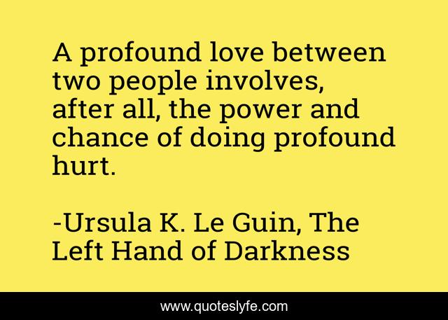 This page presents the quote "A profound love between two people involves, after all, the power and chance of doing profound hurt.". Author of this quote is Ursula K. Le Guin, The Left Hand of Darkness. This quote is about love, science-fiction, affection, hurt,.