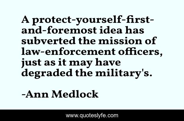 This page presents the quote "A protect-yourself-first-and-foremost idea has subverted the mission of law-enforcement officers, just as it may have degraded the military's.". Author of this quote is Ann Medlock. This quote is about military, law-enforcement, patriotism, police,.