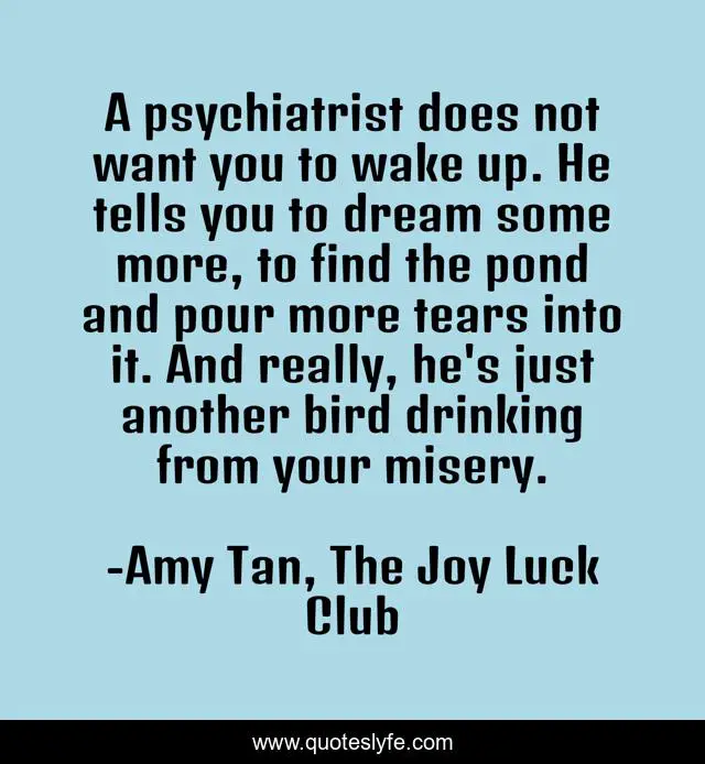 This page presents the quote "A psychiatrist does not want you to wake up. He tells you to dream some more, to find the pond and pour more tears into it. And really, he's just another bird drinking from your misery.". Author of this quote is Amy Tan, The Joy Luck Club. This quote is about suffering, misery, psychiatrists,.