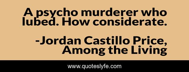 "Jordan Castillo Price, Among the Living Quotes." Quoteslyfe.com, 2025. Sat. 06 Dec. 2025. <https://www.quoteslyfe.com/quote/A-psycho-murderer-who-lubed-How-considerate-210771>.