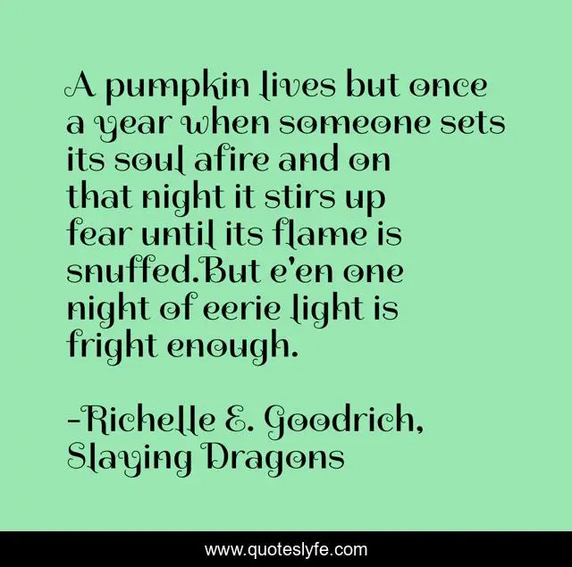 This page presents the quote "A pumpkin lives but once a year when someone sets its soul afire and on that night it stirs up fear until its flame is snuffed.But e'en one night of eerie light is fright enough.". Author of this quote is Richelle E. Goodrich, Slaying Dragons. This quote is about hallows-eve, halloween-poem, richelle-e-goodrich, halloween, richelle, richelle-goodrich, halloween-poems,.