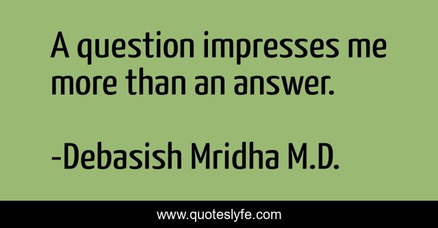 "Debasish Mridha M.D. Quotes." Quoteslyfe.com, 2025. Sat. 06 Dec. 2025. <https://www.quoteslyfe.com/quote/A-question-impresses-me-more-than-an-136037>.