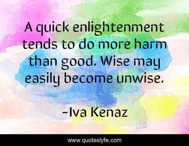 This page presents the quote "A quick enlightenment tends to do more harm than good. Wise may easily become unwise.". Author of this quote is Iva Kenaz. This quote is about fantasy-fiction, metaphysical, wisdom, inspirational, enthusiasm, enlightenment, metaphysics,.