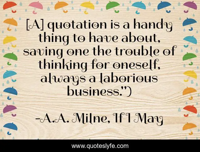This page presents the quote "[A] quotation is a handy thing to have about, saving one the trouble of thinking for oneself, always a laborious business.")". Author of this quote is A.A. Milne, If I May. This quote is about independent-thought, quotations, quotes,.