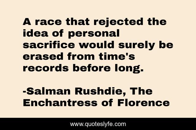 This page presents the quote "A race that rejected the idea of personal sacrifice would surely be erased from time's records before long.". Author of this quote is Salman Rushdie, The Enchantress of Florence. This quote is about life, sacrifice, record, race, time, humanity,.
