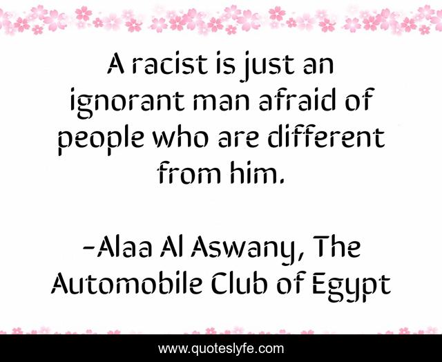 This page presents the quote "A racist is just an ignorant man afraid of people who are different from him.". Author of this quote is Alaa Al Aswany, The Automobile Club of Egypt. .