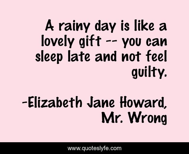 This page presents the quote "A rainy day is like a lovely gift -- you can sleep late and not feel guilty.". Author of this quote is Elizabeth Jane Howard, Mr. Wrong. This quote is about humorous, rainy-day,.