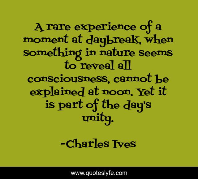 This page presents the quote "A rare experience of a moment at daybreak, when something in nature seems to reveal all consciousness, cannot be explained at noon. Yet it is part of the day's unity.". Author of this quote is Charles Ives. This quote is about unity, day, experience,.