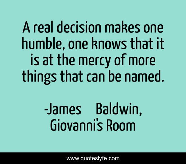 This page presents the quote "A real decision makes one humble, one knows that it is at the mercy of more things that can be named.". Author of this quote is James Baldwin, Giovanni's Room. This quote is about mercy, decision, humble, life,.