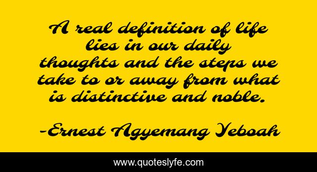 This page presents the quote "A real definition of life lies in our daily thoughts and the steps we take to or away from what is distinctive and noble.". Author of this quote is Ernest Agyemang Yeboah. This quote is about act-well, life, steps-in-life, daily-inspiration, reality-of-life, daily, daily-life, real-life, real-life-facts,.