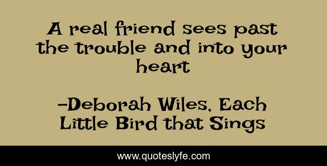 This page presents the quote "A real friend sees past the trouble and into your heart". Author of this quote is Deborah Wiles, Each Little Bird that Sings. .