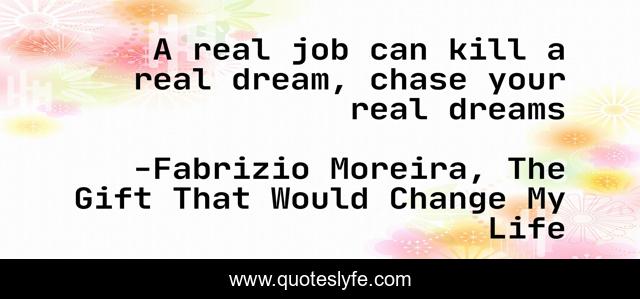 This page presents the quote "A real job can kill a real dream, chase your real dreams". Author of this quote is Fabrizio Moreira, The Gift That Would Change My Life. This quote is about enthusiasm, leadership, inspirational, success, entrepreneurship,.