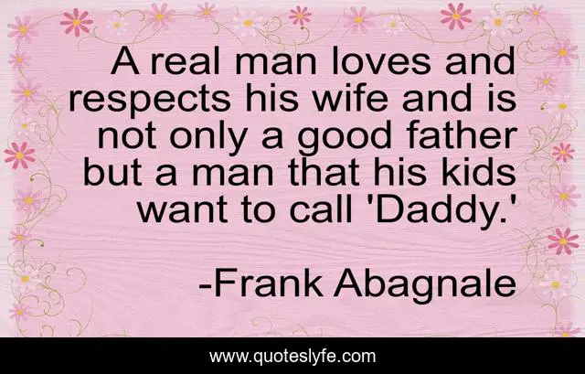 This page presents the quote "A real man loves and respects his wife and is not only a good father but a man that his kids want to call 'Daddy.'". Author of this quote is Frank Abagnale. This quote is about man, father, wife,.