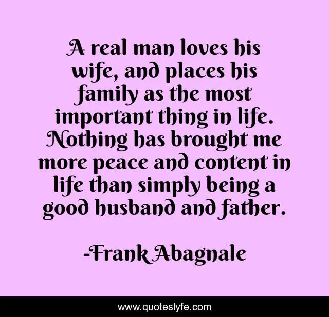 This page presents the quote "A real man loves his wife, and places his family as the most important thing in life. Nothing has brought me more peace and content in life than simply being a good husband and father.". Author of this quote is Frank Abagnale. This quote is about life, peace, family,.