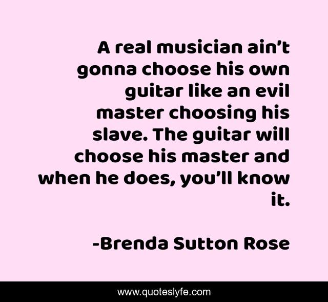 This page presents the quote "A real musician ain’t gonna choose his own guitar like an evil master choosing his slave. The guitar will choose his master and when he does, you’ll know it.". Author of this quote is Brenda Sutton Rose. This quote is about jazz, musician, soul, guitar, music, guitars, rock-and-roll, blues,.