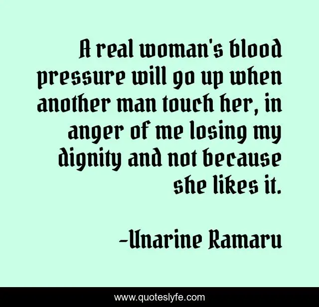 This page presents the quote "A real woman's blood pressure will go up when another man touch her, in anger of me losing my dignity and not because she likes it.". Author of this quote is Unarine Ramaru. This quote is about relationships, cheating, love, commitment, devotion, anger, affection,.