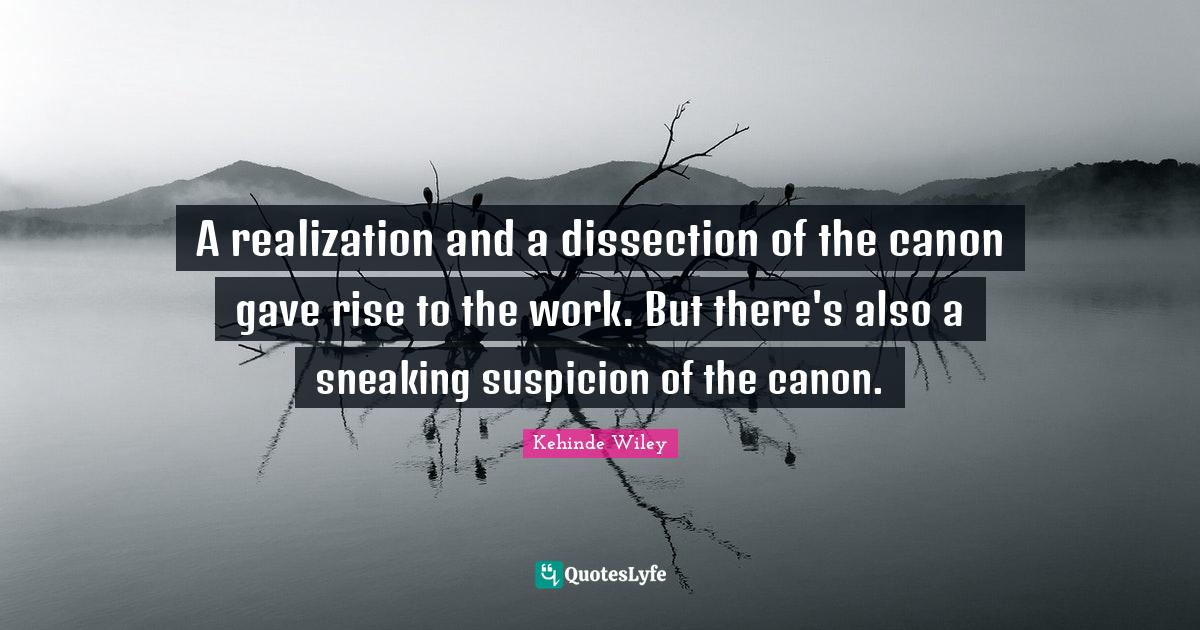 This page presents the quote "A realization and a dissection of the canon gave rise to the work. But there's also a sneaking suspicion of the canon.". Author of this quote is Kehinde Wiley. This quote is about suspicion, canon, dissection, realization, work,.