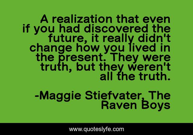 This page presents the quote "A realization that even if you had discovered the future, it really didn't change how you lived in the present. They were truth, but they weren't all the truth.". Author of this quote is Maggie Stiefvater, The Raven Boys. This quote is about premonition, future,.