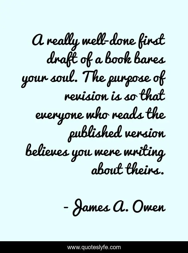 This page presents the quote "A really well-done first draft of a book bares your soul. The purpose of revision is so that everyone who reads the published version believes you were writing about theirs.". Author of this quote is James A. Owen. This quote is about enthusiasm, writing-craft, inspirational, dragons,.