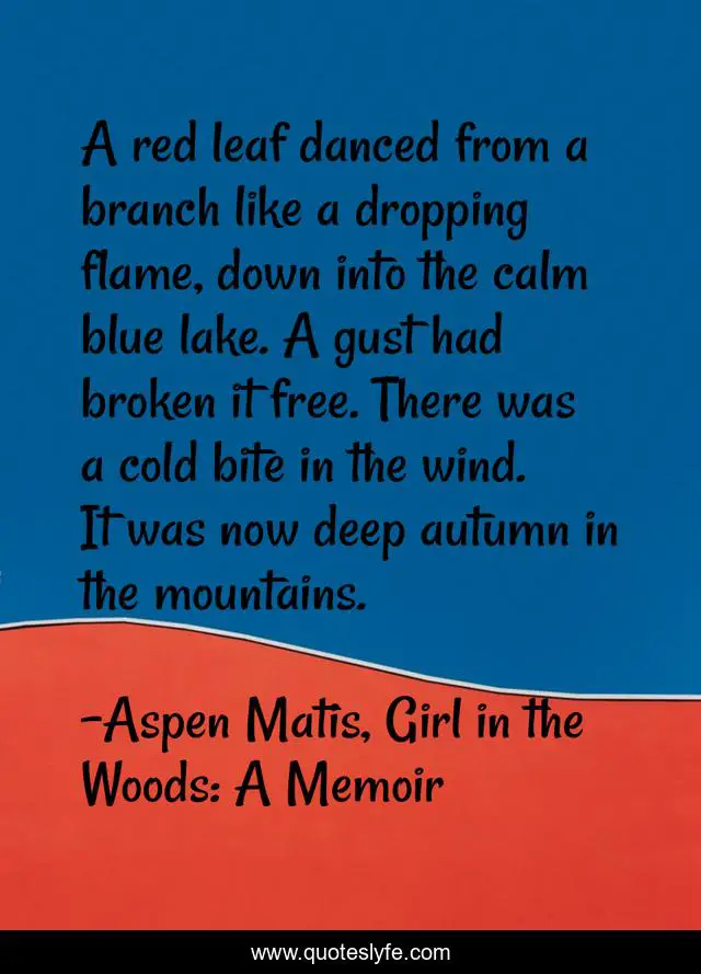 This page presents the quote "A red leaf danced from a branch like a dropping flame, down into the calm blue lake. A gust had broken it free. There was a cold bite in the wind. It was now deep autumn in the mountains.". Author of this quote is Aspen Matis, Girl in the Woods: A Memoir. This quote is about mountains, cold-wind, red-leaf, fall,.