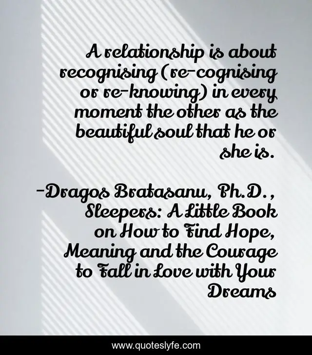 This page presents the quote "A relationship is about recognising (re-cognising or re-knowing) in every moment the other as the beautiful soul that he or she is.". Author of this quote is Dragos Bratasanu, Ph.D., Sleepers: A Little Book on How to Find Hope, Meaning and the Courage to Fall in Love with Your Dreams. This quote is about relationships, love, affection,.