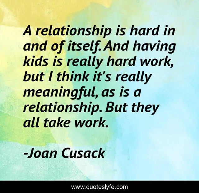 This page presents the quote "A relationship is hard in and of itself. And having kids is really hard work, but I think it's really meaningful, as is a relationship. But they all take work.". Author of this quote is Joan Cusack. This quote is about work, meaningful, hard work,.