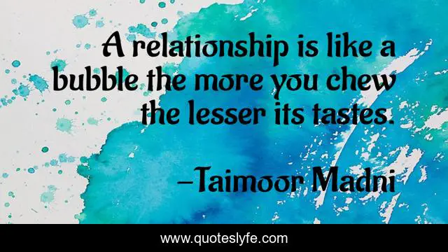 This page presents the quote "A relationship is like a bubble the more you chew the lesser its tastes.". Author of this quote is Taimoor Madni. This quote is about relationships, love, romantic, affection, lovestory,.