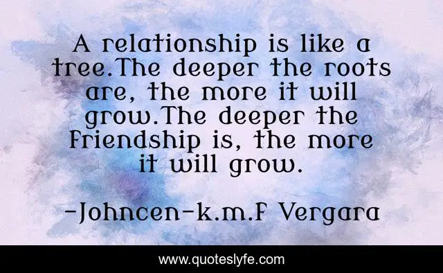 This page presents the quote "A relationship is like a tree.The deeper the roots are, the more it will grow.The deeper the friendship is, the more it will grow.". Author of this quote is Johncen-k.m.f Vergara. This quote is about friendship, love, relationship, affection, wisdom,.
