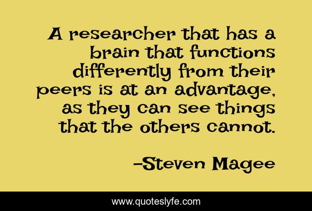 This page presents the quote "A researcher that has a brain that functions differently from their peers is at an advantage, as they can see things that the others cannot.". Author of this quote is Steven Magee. This quote is about functions, mental, advantage, researcher, things, peers, research, brain, see,.