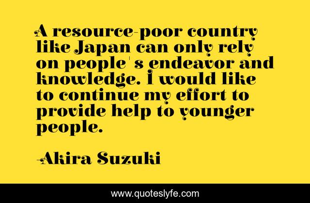 This page presents the quote "A resource-poor country like Japan can only rely on people's endeavor and knowledge. I would like to continue my effort to provide help to younger people.". Author of this quote is Akira Suzuki. This quote is about effort, help, people,.