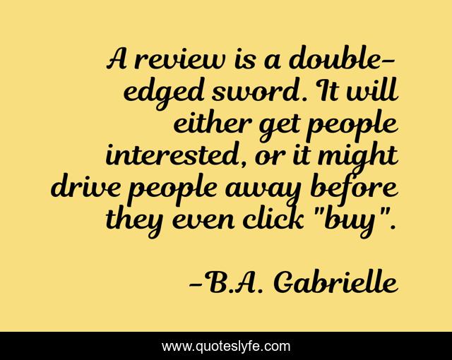 This page presents the quote "A review is a double-edged sword. It will either get people interested, or it might drive people away before they even click "buy".". Author of this quote is B.A. Gabrielle. .