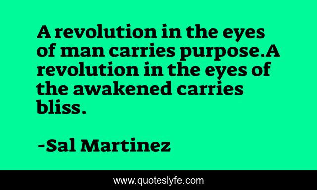 This page presents the quote "A revolution in the eyes of man carries purpose.A revolution in the eyes of the awakened carries bliss.". Author of this quote is Sal Martinez. This quote is about wisdom, enlightenment, attitude, buddha-nature, behaviour, buddhism, bliss, poetry, quotations,.