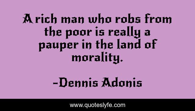 This page presents the quote "A rich man who robs from the poor is really a pauper in the land of morality.". Author of this quote is Dennis Adonis. This quote is about dennis-adonis, riches, morality-life, morality,.