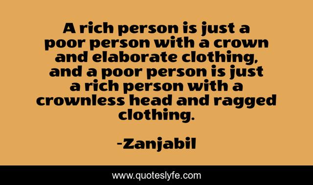This page presents the quote "A rich person is just a poor person with a crown and elaborate clothing, and a poor person is just a rich person with a crownless head and ragged clothing.". Author of this quote is Zanjabil. This quote is about poor, humor, knowledge, metaphorical, inspirational, wisdom, truth, politics, enthusiasm,.