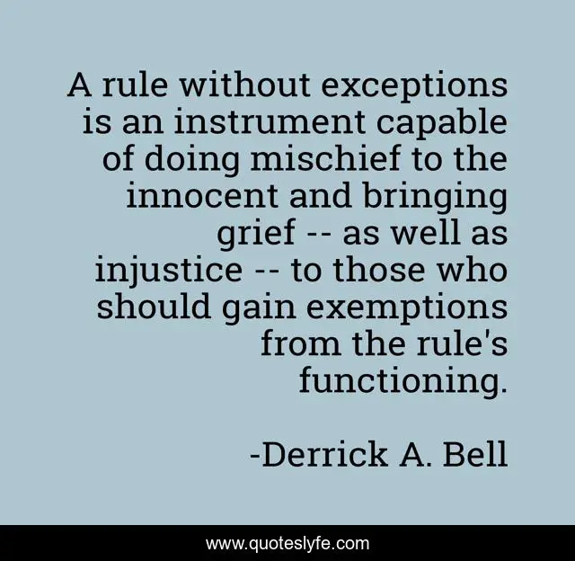 This page presents the quote "A rule without exceptions is an instrument capable of doing mischief to the innocent and bringing grief -- as well as injustice -- to those who should gain exemptions from the rule's functioning.". Author of this quote is Derrick A. Bell. This quote is about function, justice, grief, rules, injustice, innocence, exceptions,.