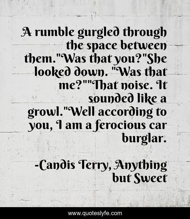 This page presents the quote "A rumble gurgled through the space between them."Was that you?"She looked down. "Was that me?""That noise. It sounded like a growl."Well according to you, I am a ferocious car burglar.". Author of this quote is Candis Terry, Anything but Sweet. This quote is about sweet, reno, charli,.