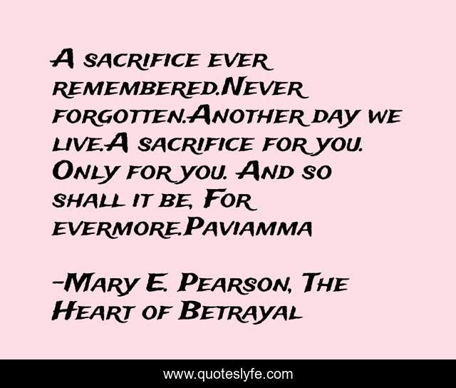 "Mary E. Pearson, The Heart of Betrayal Quotes." Quoteslyfe.com, 2025. Tue. 09 Dec. 2025. <https://www.quoteslyfe.com/quote/A-sacrifice-ever-remembered-Never-forgotten-Another-198396>.