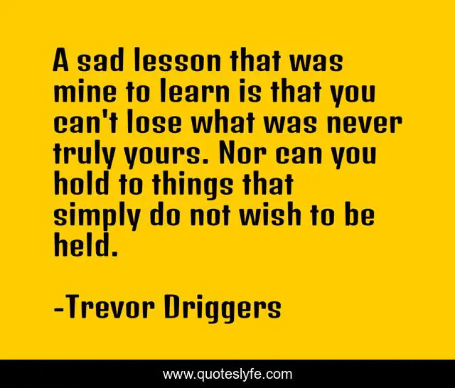 This page presents the quote "A sad lesson that was mine to learn is that you can't lose what was never truly yours. Nor can you hold to things that simply do not wish to be held.". Author of this quote is Trevor Driggers. This quote is about loss, letting-things-go, love, letting-go, losing-love, sadness, life-lessons, pain, moving-on,.