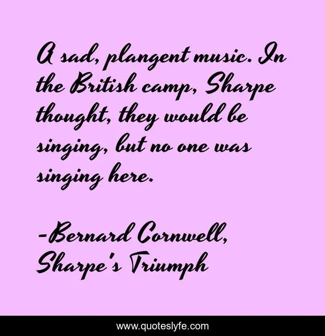 This page presents the quote "A sad, plangent music. In the British camp, Sharpe thought, they would be singing, but no one was singing here.". Author of this quote is Bernard Cornwell, Sharpe's Triumph. This quote is about camp, british, sad, plangent, music, here, sharpe, singing,.