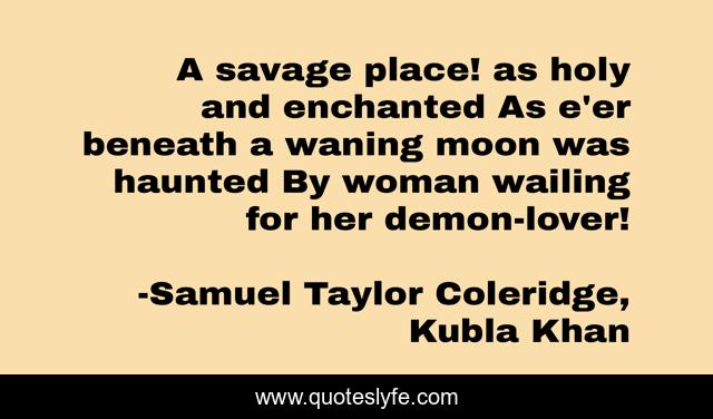 This page presents the quote "A savage place! as holy and enchanted As e'er beneath a waning moon was haunted By woman wailing for her demon-lover!". Author of this quote is Samuel Taylor Coleridge, Kubla Khan. .