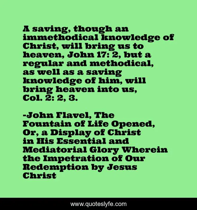 This page presents the quote "A saving, though an immethodical knowledge of Christ, will bring us to heaven, John 17: 2, but a regular and methodical, as well as a saving knowledge of him, will bring heaven into us, Col. 2: 2, 3.". Author of this quote is John Flavel, The Fountain of Life Opened, Or, a Display of Christ in His Essential and Mediatorial Glory Wherein the Impetration of Our Redemption by Jesus Christ. This quote is about heaven, salvation, christ, puritans, knowledge,.