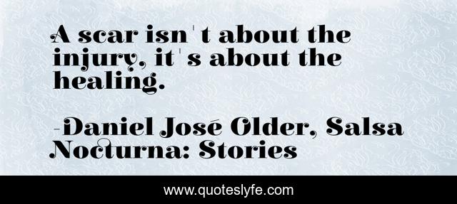 This page presents the quote "A scar isn't about the injury, it's about the healing.". Author of this quote is Daniel José Older, Salsa Nocturna: Stories. This quote is about enthusiasm, healing, inspirational,.