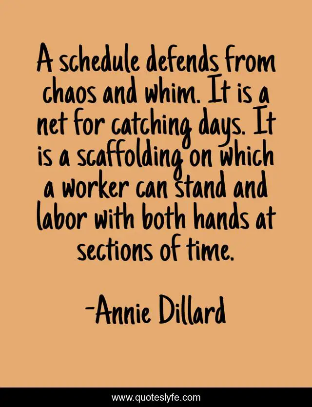 This page presents the quote "A schedule defends from chaos and whim. It is a net for catching days. It is a scaffolding on which a worker can stand and labor with both hands at sections of time.". Author of this quote is Annie Dillard. .