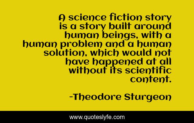 This page presents the quote "A science fiction story is a story built around human beings, with a human problem and a human solution, which would not have happened at all without its scientific content.". Author of this quote is Theodore Sturgeon. This quote is about sci-fi, science-fiction,.